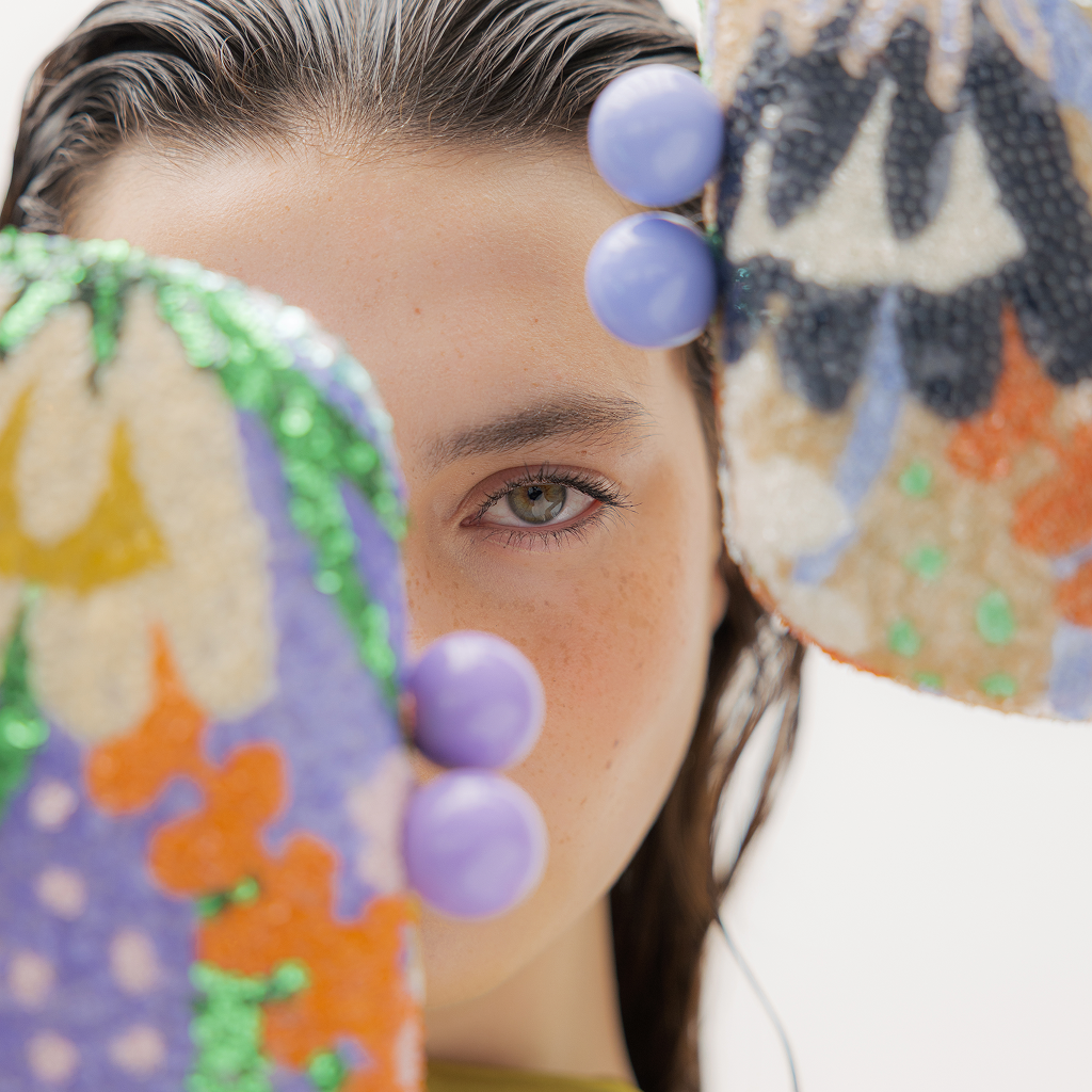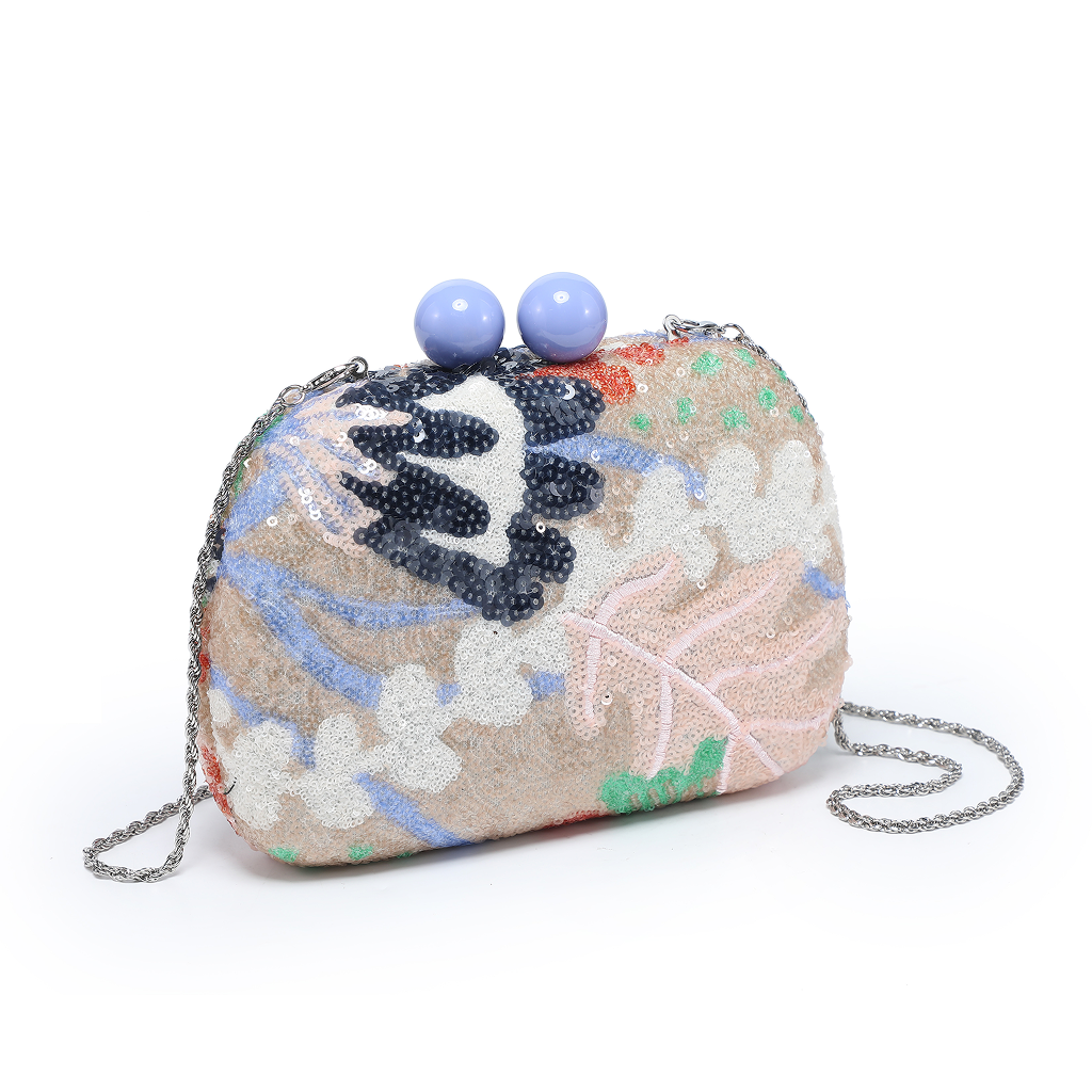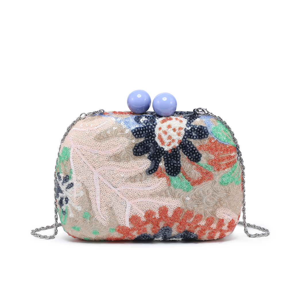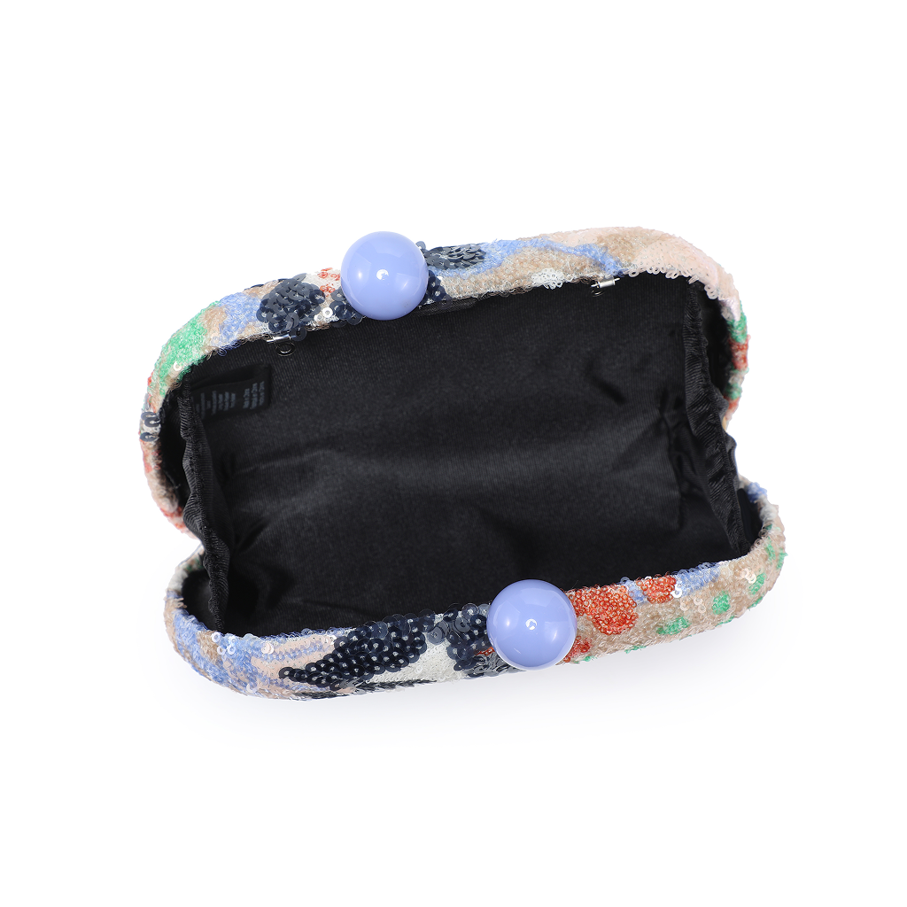 Sequin pattern clutch with top knob opening